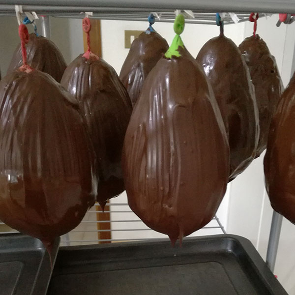 - Dopo aver sciolto il cioccolato a bagnomaria, spennella leggermente i bordi di metà uovo e chiudi con l’altra parte di uovo di cioccolato.